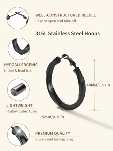 retro Black/18K Gold Plated/Stainless Steel Hoop Earrings for Women 20mm/30mm/40mm/60mm/80mm Oversized Hypoallergenic Chunky Tube Hoops Rounded Loop Earrings Come with Box