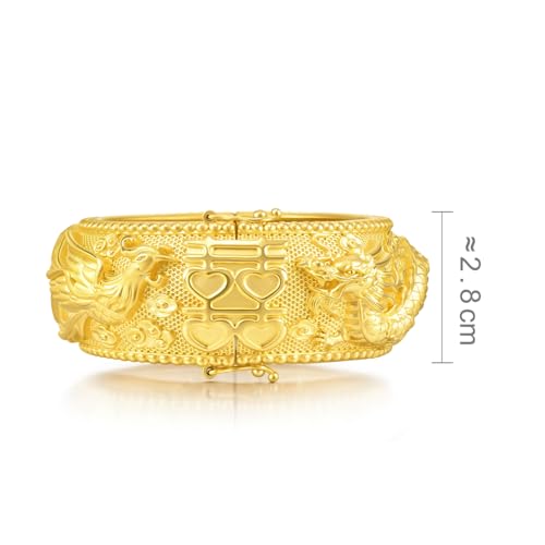 - Crafted in solid gold with advanced hard gold electroforming, this bangle showcases a lifelike dragon and phoenix design—symbols of harmony and prosperity. At the center, the “Double Happiness (囍)” character is paired with auspicious cloud motifs and fine detailing, symbolizing a blissful union and heartfelt blessings for treasure and marriage.