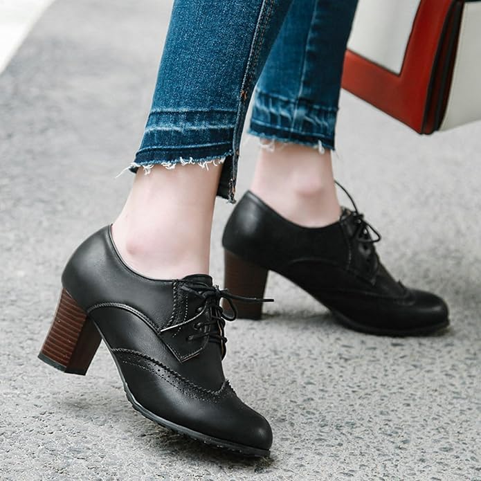 Women's Chunky High Heels Wingtip Oxfords Round Toe Lace Up Chunky Block Heel Office Shoes Party Dress Shoes